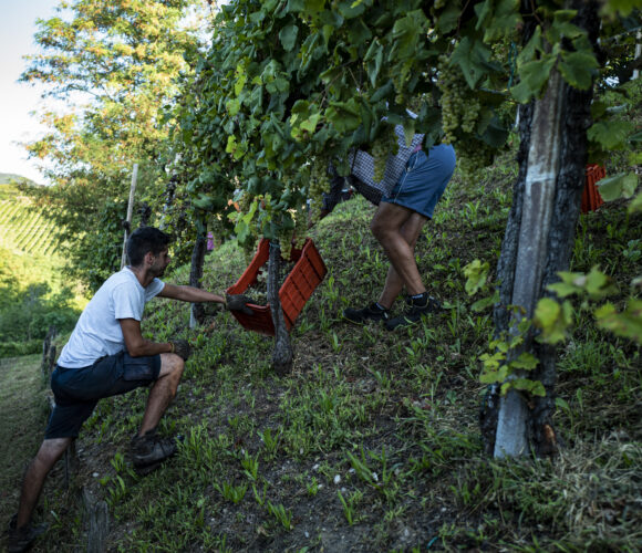 Con Alti uses grapes from vineyards grown with a variety of trellis types, depending on when they were planted. Some of the vines are even supported by trees. Half the grapes in Con Alti wine are glera, which is the major grape in today’s proseccos; the rest consists of a variety of indigenous white grapes. They’re pressed and briefly macerated before the juice is put into bottles and sealed with crown caps. No added sugar or sulfites, and only a little over 10% alcohol.